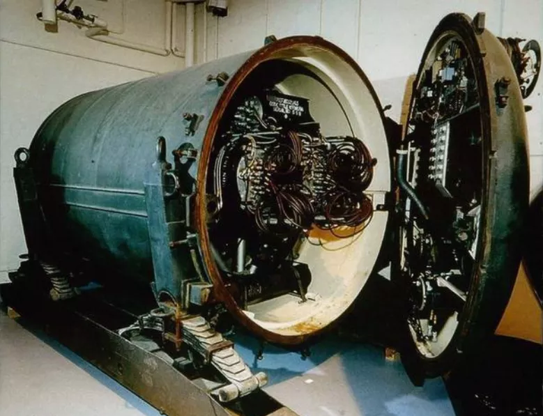 不过当时的北约陆军力量比起苏联太弱小了,他们计划在联邦德国埋下核地雷,以此来阻挡苏联的钢铁洪流,当然这么一来,联邦德国就算加入北约,一旦爆发战争,自己国土上肯定也是人间地狱。但是,除了这种办法,北约想阻挡苏联坦克,还真没太好的办法。经过美军试验证明,核地雷能产生用一般技术手段很难通过的巨大弹坑,对敌军装甲部队机动起到严重阻滞作用。一枚万吨级TNT当量的核地雷在地表引爆后,能产生直径90米、深20米的巨大炸坑。除巨型炸坑外,核地雷还能产生大面积放射性沾染区,妨害装甲部队作战。图为英国“蓝孔雀”核地雷
