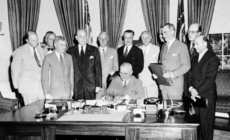 这事情以后,西欧各国说什么都得防着他们,但自己刚经历战争,要啥啥没有,那怎么办呢?必须得让美国给个永久保护。 美国总统杜鲁门在《北大西洋公约》签字