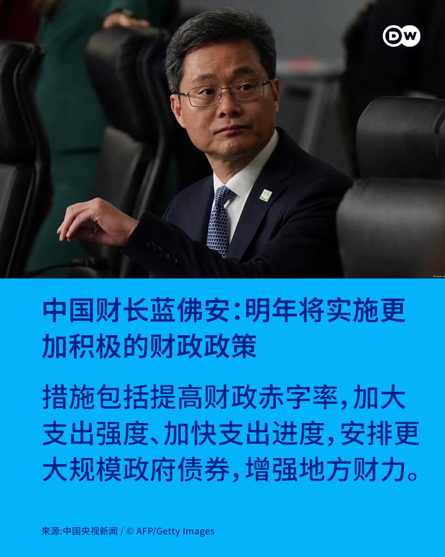 中国官方的中央电视台报道称,周二,在北京召开的“全国财政工作会议”上,财政部长蓝佛安表示,中国将“提高财政赤字率,加大支出强度、加快支出进度。”蓝佛安表示,明年财政工作的重点将是“大力提振消费,加大消费品以旧换新支持力度。”“增加对地方转移支付,增强地方财力”。