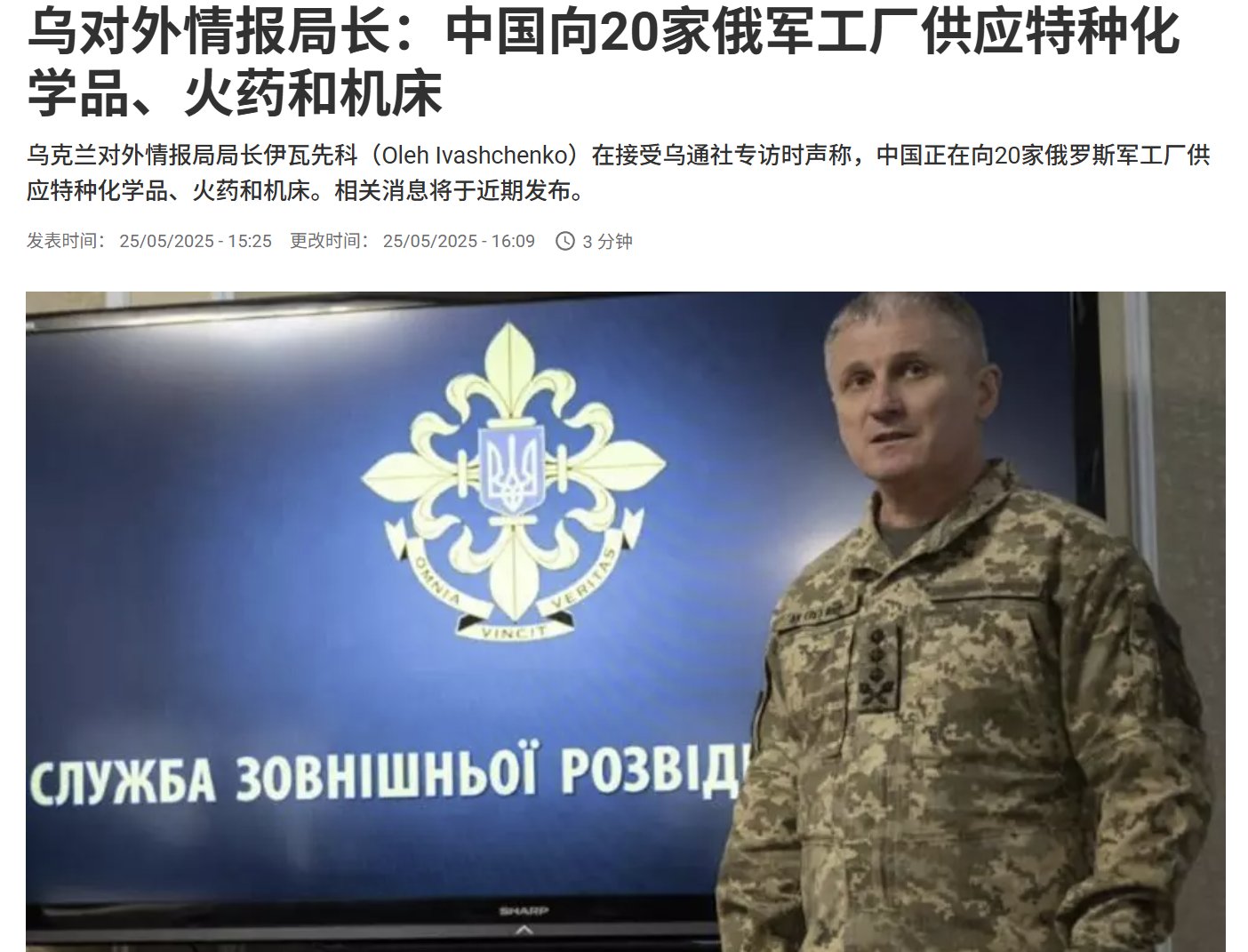 乌克兰对外情报局局长伊瓦先科(Oleh Ivashchenko)在接受乌通社专访时声称,中国正在向20家俄罗斯军工厂供应特种化学品、火药和机床。相关消息将于近期发布。