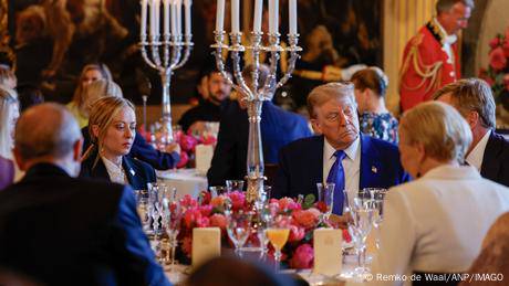 意大利总理梅洛尼在今年4月访问白宫期间同样对特朗普大唱赞歌,以至于特朗普随后也对这位意大利“杰出的政治家”赞不绝口。特朗普说,梅洛尼“席卷了欧洲”,非常受尊敬。 图为北约海牙峰会荷兰王室的招待晚宴:意大利总理梅洛尼坐在美国总统特朗普旁边