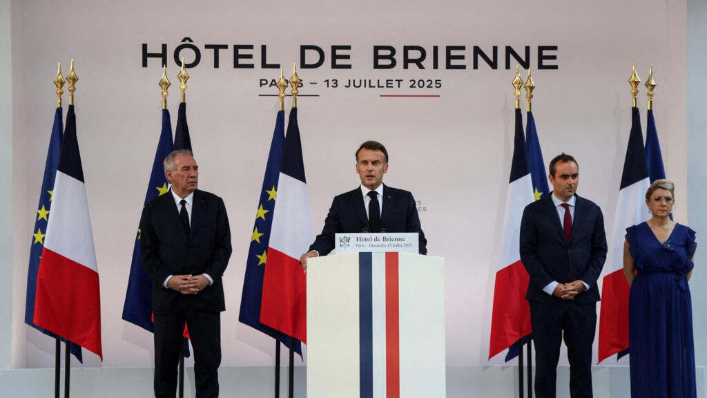 2025年7月13日,法国巴黎,一年一度的法国国庆阅兵前夕,法国总统马克龙在法国总理贝鲁、法国武装部队部长塞巴斯蒂安-勒科尔努和法国记忆与退伍军人事务代表部长帕特里夏-米拉莱斯的陪同下,向法军高级将领发表讲话。