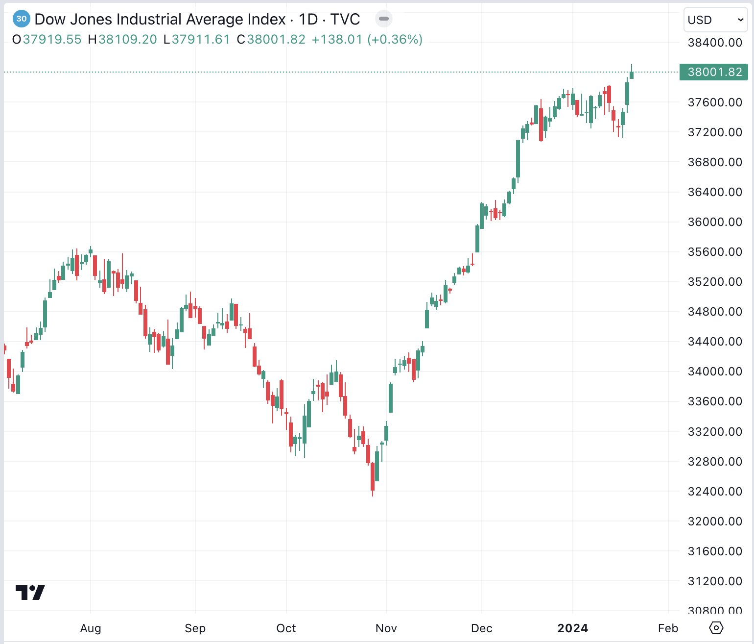 (纽约23日讯)华尔街股市连升三日,道琼斯指数首次收在38000水平以上,连同标普500指数连续两日创即市和收市新高。