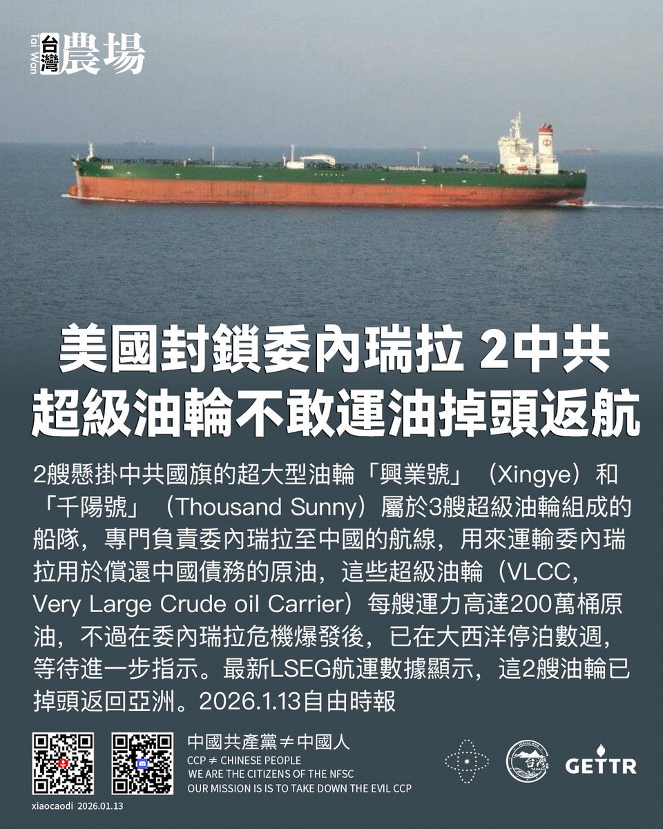 美國封鎖委內瑞拉! 2艘中共超級油輪不敢運油掉頭返航2艘懸掛中共國旗的超大型油輪「興業號」(Xingye)和「千陽號」(Thousand  Sunny)屬於3艘超級油輪組成的船隊,專門負責委內瑞拉至中國的航線,用來運輸委內瑞拉用於償還中國債務的原油,這些超級油輪(VLCC,Very ...